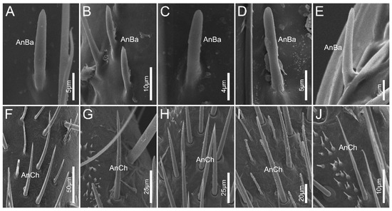 Antennal sensilla sensilla basiconica and antennal sensilla trichodea IV of the sampled reduviid species. (A,F) Ectrychotes andreae; (B,G) Haematoloecha limbata; (C,H) Labidocoris pectoralis; (D,I) Neozirta eidmanni; (E,J) Opistoplatys majusculas. Abbreviations: AnBa, antennal sensilla basiconica; AnCh, antennal sensilla chaetica.