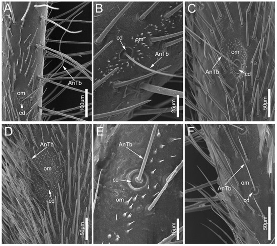 Antennal trichobothria (AnTb) are long and very flexible (Figure 5). The sockets of AnTb are set within a circular depression (cd) surrounded by an oval membrane (om). In the six examined species, AnTb are significantly rarer in number and only distribute on the pedicel.