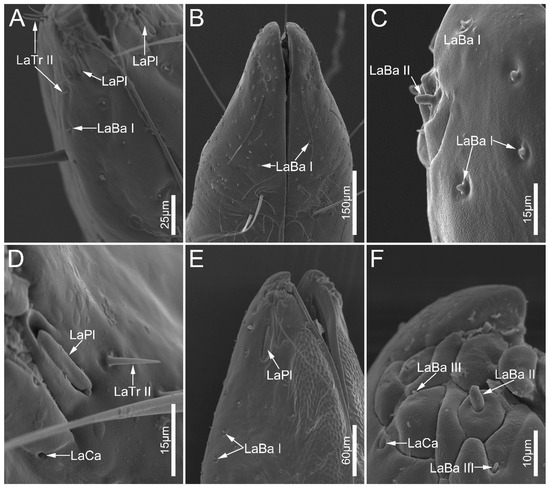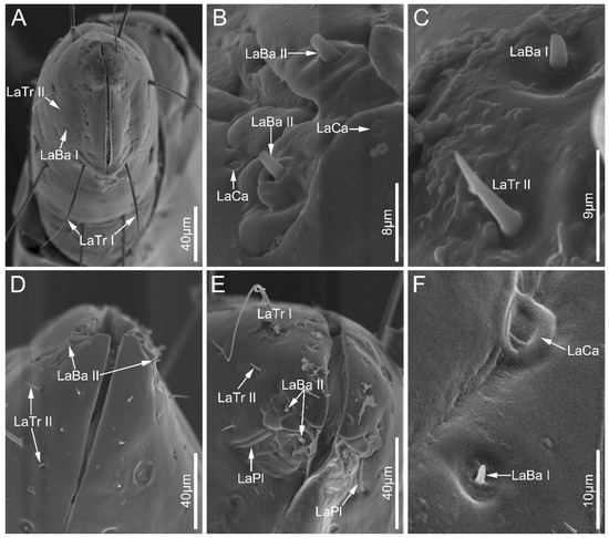 Sensilla on labial apex of Ectrychotes andreae (A–C) and Haematoloecha walkeri (D–F). Abbreviations: LaBa I–II, labial sensilla basiconica I–II; LaCa, labial sensilla campaniformia; LaTr I–II, labial sensilla trichodea I–II; and LaPl, sensilla placoidea.