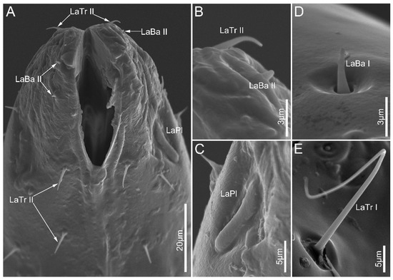 Sensilla on labial apex of Tribelocephala walkeri (A–C), Opistoplatys majusculas (D), and Opistoplatys sp.(E). Abbreviations: LaBa I–II, labial sensilla basiconica I–II; LaTr I–II, labial sensilla trichodea I–II; and LaPl, sensilla placoidea.