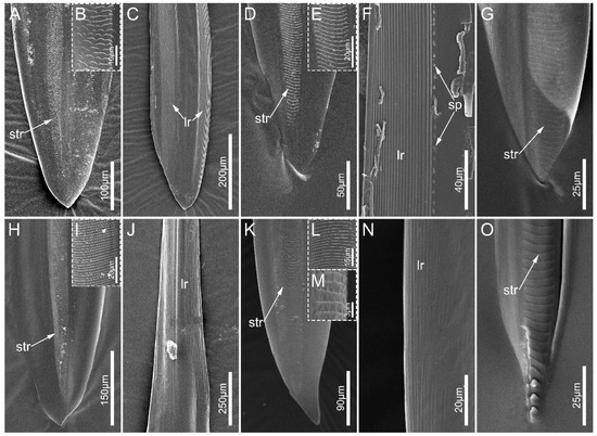 Mandibular stylets of the sampled reduviid species. (A–C) Ectrychotes andreae; (D–F) Labidocoris pectoralis; (G) Opistoplatys majusculas; (H–J) Haematoloecha limbata; (K–N) Neozirta eidmanni; (O) Tribelocephala walkeri. (B,E,I,L) showing enlarged view of slightly transverse ridges; (M) showing the lateral details of slightly transverse ridges. Abbreviations: sp. small projections; str, slightly transverse ridges; lr, longitudinal ridges.