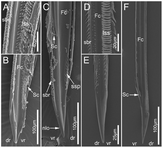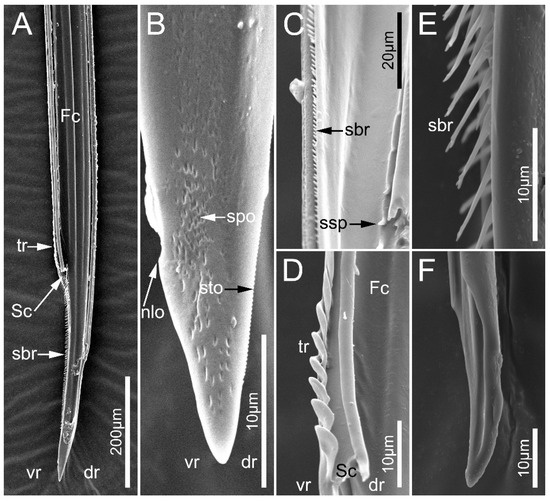 In the seven surveyed species, the maxillary stylets are left–right asymmetrical and interlocked, forming a food canal (Fc) and salivary canal (Sc) (Figure 10A,D and Figure 11B–D,F). The left maxillary stylet (LMx) has a straight, sharp-tipped apex with many small teeth (sto). Ectrichodiinae species possess a small narrow lobe (nlo) on the apex of the left maxillary stylet (Figure 10B and Figure 11C). On the internal surface of the apex of the left maxillary stylet, there are several small spines (ssp) (Figure 10C and Figure 11C). There are some transverse ridges (tr) and short bristles (sbr) on the subapical region of the inner side of the left maxilla in ectrichodiines (Figure 10A,C,D,E and Figure 11C,D). The short bristles are absent on the inner side of the left maxillary stylet in sampled tribelocephalines. Many small pores (spo) distribute on the external surface of the left maxillary stylet (Figure 10B). The apex of the right maxillary stylet (RMx) is tapered, and slightly curved with a blunt tip (Figure 10F and Figure 11B,D). There are ventral (vr) and dorsal rows (dr) of curved hair-shaped short bristles (sbr) on the internal side of each right maxillary stylet, and the ventral rows possess many lamellate structures (lss) (Figure 11A,D).