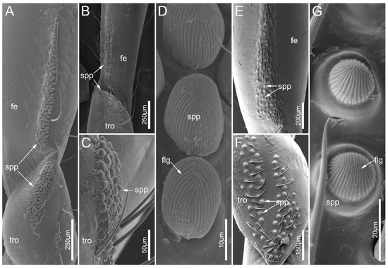 Small papillae on legs of Ectrychotes andreae and Haematoloecha limbata. (A–D) Ectrychotes andreae; (E–G) Haematoloecha limbata. (A,E,F) forelegs; (B) midlegs; and (C) hindlegs. (D,G) showing enlarged view of the small papillae. Abbreviations: fe, femur; flg, finger-print-like grains; spp, small papillae; tro, trochanter.