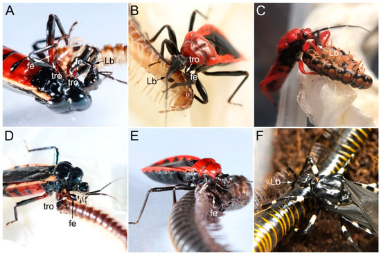 Preying behavior of sampled ectrichodiines on millipede. (A,D) Ectrychotes andreae preying on Oxidus gracilis; (B) Haematoloecha limbata preying on Oxidus gracilis; (C) Labidocoris pectoralis preying on Helicorthomorpha holstii; (E) Haematoloecha limbata preying on Spirobolus bungii; (F) Neozirta eidmanni preying on Spirobolus bungii. Abbreviations: fe, femur; Lb, labium; and tro, trochanter.