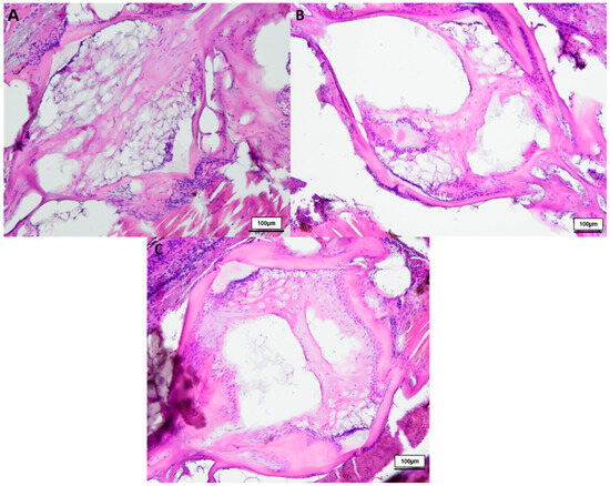 HE-stained vertebral body with intervertebral discs of healthy (A) 8-week-old (n = 3), (B) 12-week-old (n = 3) and (C) 18-week-old (n = 3) male N. furzeri, original magnification 100×. (Scale bar = 100 µm).
