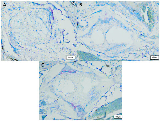 In total we investigated three 8-week-, three 12-week- and three 18-week-old male killifish. Additionally, four 21.5-week-old male killifish, with visible vertebral deformations, were examined. Vertebral deformations occur spontaneously in approximately 1–2% of the background population. During our experiment, we observed reduced locomotor activity in the older fish population, which occurs mostly at around 20 weeks of age. Figure 1 shows the differences in the intervertebral area between healthy young and old N. furzeri. Comparing them with each other, younger fish (8 weeks) showed mostly a spongy-like tissue containing vacuolated notochord cells and a beginning formation of fibrous tissue inside the vertebrae. Older fish (12 weeks and 18 weeks) showed fibrous tissue in the central region and a spongy-like tissue in the peripheral region, which contains regressing vacuolated notochord cells. Next to the intervertebral ligament, osteoblasts were visible, which are present in higher numbers in younger than older killifish, as similarly observed in our previous publication (for review see [23]). Similar results were visible in the toluidine blue staining (see Figure 2).
