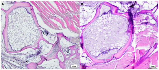 HE-stained vertebral body with intervertebral discs of two deformed 21.5-week-old (n = 4) male N. furzeri (A,B), original magnification 100×. (Scale bar = 100 µm).