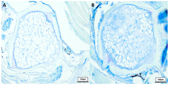 Comparing healthy male N. furzeri with the deformed fish (shown in Figure 3), we observed similarities between the 8-week-old and deformed killifish. N. furzeri with vertebral deformations also showed a spongy-like structure, containing vacuolated notochord cells, but here no formation of fibrous tissue in the intervertebral area was detected. Toluidine blue-stained sections revealed similar results, shown in Figure 4.