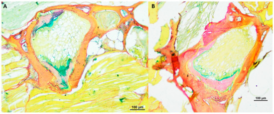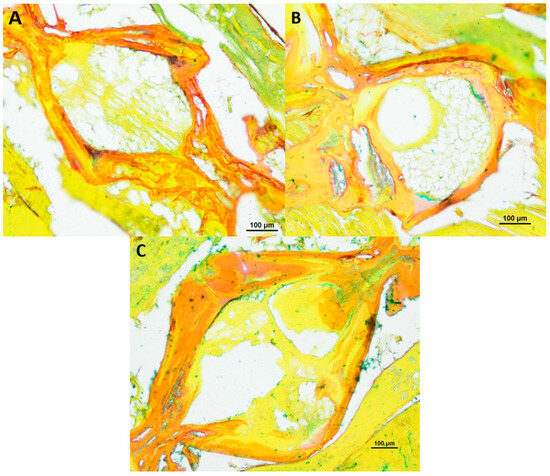 Furthermore, we conducted a comprehensive analysis of the intervertebral area in N. furzeri using alcian blue/picrosirius red staining, as illustrated in Figure 5 and Figure 6. This specific staining, for the visualization of glycosaminoglycans and collagen type I and III, revealed that the spongy-like structure, containing vacuolated notochord cells, and the fibrous area in the central region seem to consist mostly of type III collagen, as analyzed additionally with polarizing optics (results not shown). These structures were found especially in older healthy killifish. Furthermore, we detected type III collagen within the trabecular structures of the vertebrae. The bone matrix of N. furzeri consisted mainly of type I collagen. We could not detect any differences in regard to age or deformity.