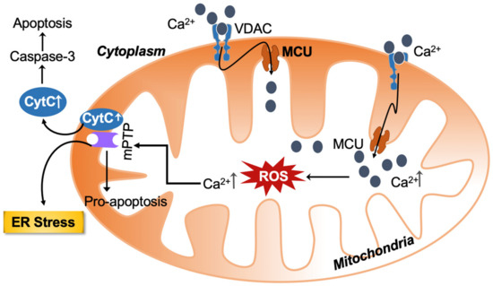 Calcium and ROS-mediated crosstalk between mitochondria and the endoplasmic reticulum (ER) amplify the deleterious cellular effect. The increased ROS and calcium load-mediated opening of the mitochondrial permeability transition pore causes the release of pro-apoptotic substances. ROS can also target ER-based calcium channels, increasing calcium release and ROS levels in the process. Calcium—Ca2+; VDAC—voltage-dependent anion channel; MCU—mitochondrial calcium uniporter; ROS—reactive oxygen species; mPTP—mitochondrial permeability transition pore; CytC—cytochrome c; ER—endoplasmic reticulum.