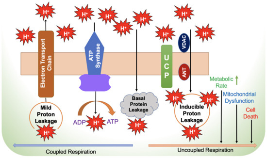 Mechanism of electron leakage during coupled and uncoupled respiration. ADP—adenosine diphosphate; ANT—adenine nucleotide translocator; ATP—adenosine triphosphate; UCP—uncoupling protein; VDAC—voltage-dependent anion channel.