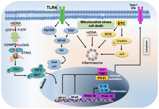 Decades of research have documented that, in addition to their classical role in energy production and metabolism, mitochondria participate in a diverse range of biological activities, including inflammation. The mitochondrial genome, potentially stemming from its bacterial origin, is a potent stimulator of innate immunity and it plays a significant role in driving inflammation [112]. MtDNA is especially vulnerable to oxidation, as it is in close physical proximity to a major source of ROS, the ETC, potentially resulting in mtDNA mutations. Furthermore, unlike nuclear DNA, mtDNA is hypomethylated and may be sensed as foreign. The presence of oxidatively damaged and unmethylated CpG motifs in endogenous mtDNA upon release into the cytoplasm and out into the extracellular milieu activates PRRs to elicit various inflammatory pathways, causing a plethora of detrimental biological consequences, including infection and cell death [113,114]. The integrated signaling networks operated by mtDNA in the inflammatory process have been targeted in the clinical management of various human pathologies [115]. The presence of pathogen-derived cellular and mtDNA in the cytosol triggers the activation of various immunogenic pathways that signals via cyclic GMP-AMP (cGAMP) synthetase (cGAS), TLR9 and NLRP3 inflammasome [116].