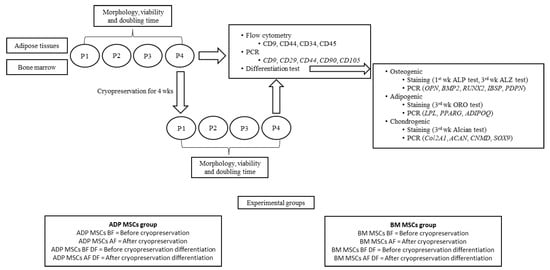Experimental design. MSCs, mesenchymal stem/stromal cells; ADP, adipose tissue; BM, bone marrow; P1–4, passage 1–4.