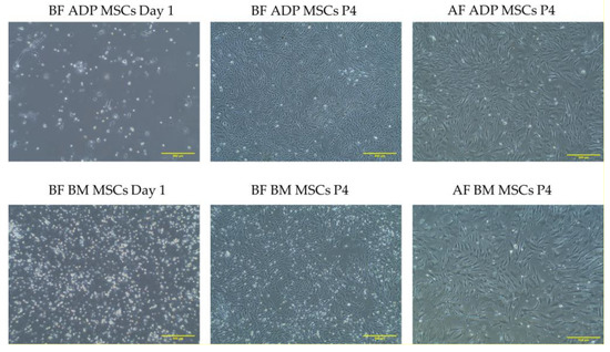 Cells were cultured and passaged until passage 4 was reached for the before (the ADP MSCs BF and BM MCs BF) and after cryopreservation (the ADP MSCs AF and BM MSCs AF) groups.