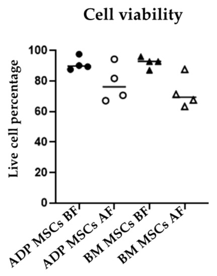 Cell viability of MSCs before and after cryopreservation. The live cell percentage of ADP MSCs and BM MSCs did not change significantly after cryopreservation. Data were analyzed with the Kruskal–Wallis test and presented as the median (n = 4). MSCs, mesenchymal stem/stromal cells; ADP, adipose tissue; BM, bone marrow; BF, before cryopreservation; AF, after cryopreservation; black circle, ADP MSCs BF; white circle, ADP MSCs AF, black triangle, BM MSCs BF; white triangle, BM MSCs AF, horizontal line, median.
