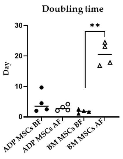Cell doubling time of MSCs before and after cryopreservation. Cell doubling times in the BM MSCs AF group increased significantly more than the BM MSCs BF group (** p < 0.01), while doubling times of ADP MSCs remained unchanged. Data were analyzed with the Kruskal–Wallis test, followed by Dunn’s multiple comparison test, and presented as the median (n = 4). MSCs, mesenchymal stem/stromal cells; ADP, adipose tissue; BM, bone marrow; BF, before cryopreservation; AF, after cryopreservation; black circle, ADP MSCs BF; white circle, ADP MSCs AF, black triangle, BM MSCs BF; white triangle, BM MSCs AF, horizontal line, median.