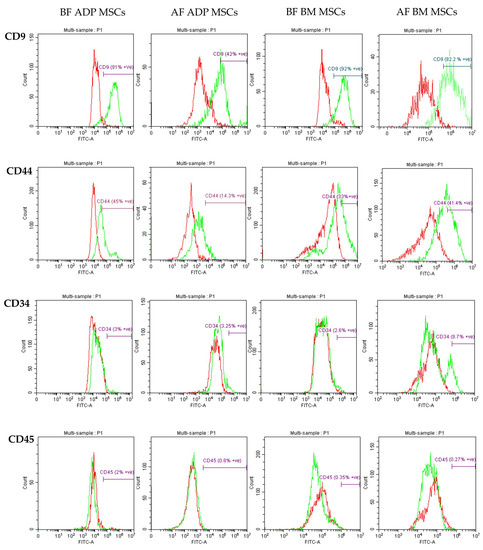 The percentage of cell surface marker expression detected via flow cytometry is presented as the median (range) and shown in Table 2. The representative histograms of surface marker expression are shown in Figure 5. In all groups, the expression of the MSC-specific markers CD9 and CD44 was high; however, the CD9 expression percentage of the ADP MSCs AF group was lower compared to that of the ADP MSCs BF group (p = 0.0401). The expression of the hematopoietic cell markers CD34 and CD45 was low.