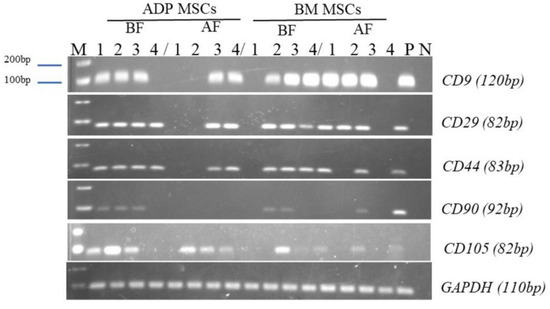 RT-PCR analysis of surface marker genes’ expression in the 4th passage of MSCs before and after cryopreservation. The numbers 1–4 are the individual numbers of the four rabbits; M, marker (DNA ladder, between 100–200 bp); P, positive control; N, negative control; MSCs, mesenchymal stem/stromal cells; ADP, adipose tissue; BM, bone marrow; BF, before cryopreservation; AF, after cryopreservation.