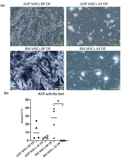 (a) Representative histological image of alkaline phosphatase staining of the induced osteogenic differentiated cells derived from rabbit ADP MSCs and BM MSCs before and after cryopreservation. The scale bar represents 500 µm. (b) The alkaline phosphatase-stained percent (%) within 6 mm2 of the observation area was analyzed with ImageJ. The stained % of the BM MSCs AF DF group was significantly lower compared to that of the BM MSCs BF DF group (* p < 0.05). Data were analyzed with the Kruskal–Wallis test, followed by Dunn’s multiple comparison test, and presented as the median (n = 4). MSCs, mesenchymal stem/stromal cells; ADP, adipose tissue; BM, bone marrow; BF, before cryopreservation; AF, after cryopreservation; DF, differentiated cells; black circle, ADP MSCs BF DF; white circle, ADP MSCs AF DF, black triangle, BM MSCs BF DF; white triangle, BM MSCs AF DF, horizontal line, median.