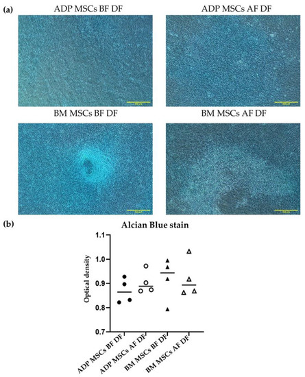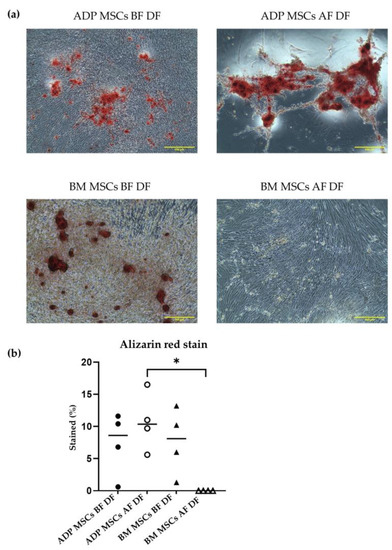 (a) Representative histological image of Alizarin Red staining of the induced osteogenic differentiated cells derived from rabbit ADP MSCs and BM MSCs before and after cryopreservation. The scale bar represents 500 µm, magnification × 40. (b) The Alizarin Red stained percent (%) of the mineral matrix deposition within 6 mm2 of the observation area was analyzed with ImageJ. The stained % of BM MSCs AF DF was significantly lower compared to that of ADP MSCs AF DF (* p < 0.05). Data were analyzed with the Kruskal–Wallis test, followed by Dunn’s multiple comparison test, and presented as the median (n = 4). MSCs, mesenchymal stem/stromal cells; ADP, adipose tissue; BM, bone marrow; BF, before cryopreservation; AF, after cryopreservation; DF, differentiated cells; black circle, ADP MSCs BF DF; white circle, ADP MSCs AF DF, black triangle, BM MSCs BF DF; white triangle, BM MSCs AF DF, horizontal line, median.