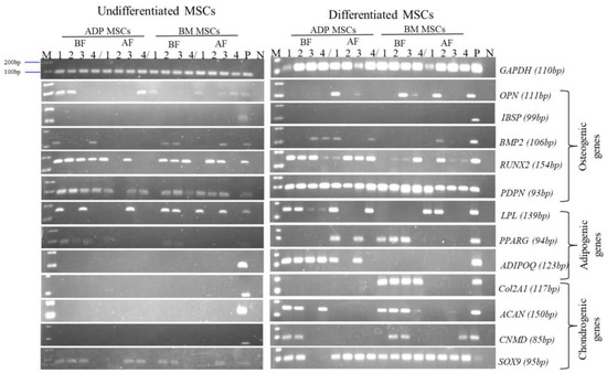 Differentiation potential is one way to evaluate the multipotentiality of MSCs. Plastic-adherent MSCs in passage 4 in the four groups (ADP MSCs BF, ADP MSCs AF, BM MSCs BF, and BM MSCs AF) were induced by the specific induction medium and evaluated for osteogenic, adipogenic, and chondrogenic differentiation capacity. Differentiated cells were confirmed by tissue-specific staining and lineage-specific gene expression analysis with RT-PCR.