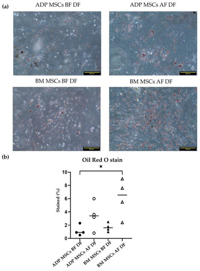 (a) Representative histological image of Oil Red O staining of the induced adipogenic differentiated cells derived from rabbit ADP MSCs and BM MSCs before and after cryopreservation. The scale bar represents 200 µm. (b) The Oil Red O-stained percent (%) of the fat vacuoles within 1 mm2 of the observation area was analyzed with ImageJ. The stained % of the BM MSCs AF DF group was significantly higher compared to that of the ADP BF DF MSCs group (* p < 0.05). Data were analyzed with the Kruskal–Wallis test, followed by Dunn’s multiple comparison test, and presented as the median (n = 4). MSCs, mesenchymal stem/stromal cells; ADP, adipose tissue; BM, bone marrow; BF, before cryopreservation; AF, after cryopreservation; DF, differentiated cells; black circle, ADP MSCs BF DF; white circle, ADP MSCs AF DF, black triangle, BM MSCs BF DF; white triangle, BM MSCs AF DF, horizontal line, median.