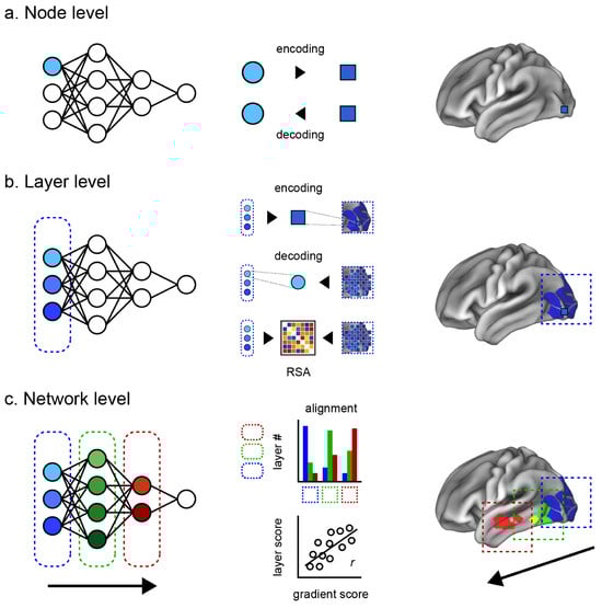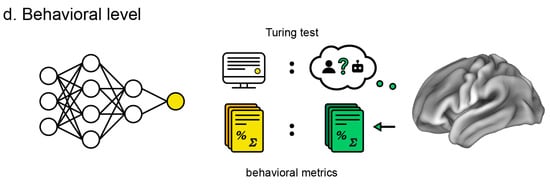 While brain–ANN correspondence at each level may be evaluated independently, the ultimate goal is not to understand each level in isolation. Thus, studies have often examined more than one level of correspondence [,,,,,,,]. Recently, researchers have attempt to summarize brain–ANN correspondence in multiple levels as a single composite score.