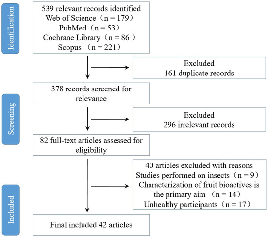 Based on Preferred Reporting Items for Systematic Reviews and Meta-Analysis (PRISMA) [14], we have extensively compiled, reviewed, and analyzed significant information on bioactive components in fruits from the best published evidence available in PubMed, Scopus (Embase), Web of Science (Web of Knowledge), and Cochrane Library (Figure 1). This review aims to highlight the interactions between fruits and GM, including enriching beneficial flora and inhibiting harmful flora, and to summarize their therapeutic application on gut-microbiota-related diseases and health. We found that the bioavailability and separation efficiency of bioactive components in fruits need to be discussed, and the mechanism of action at the cellular level also needs to be further explored. The purpose of this study was to systematically recover and review the effects of fruit bioactive substances on GM.