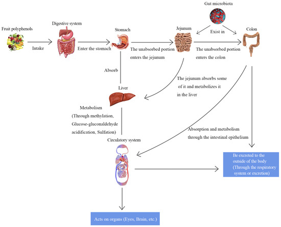 As shown in Table 2, the addition of fruit bioactive ingredients can significantly regulate the overall structure and composition of GM and further reduce gut dysbiosis. Similarly, the active ingredients in fruits are broken down and metabolized in the gut, and these metabolites enter the human circulation through the bloodstream with great health benefits, as shown in Figure 2.
