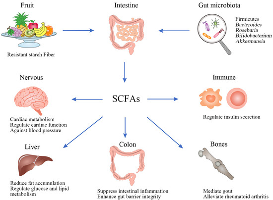 Dietary SCFAs could alter the core microbiota and enhance mucosal and humoral immune responses by improving specific innate immune parameters and suppressing gut inflammation by modulating their specific receptors [143]. It provides protection against blood pressure by reshaping the composition of the GM and regulating propionate [144]. Based on the gut–lung axis and its association with lung diseases, SCFAs prevent pulmonary disease infections by directly affecting the host immune signaling pathway [145]. The role of SCFAs also extends to peripheral immune function, such as the treatment of arthritis. Acetate has been identified to mediate gout and joint inflammation [146], while the administration of SCFAs could alleviate rheumatoid arthritis [147]. These also prove that the microbiota shapes the host’s ability to respond to extra-gut inflammatory stimuli.