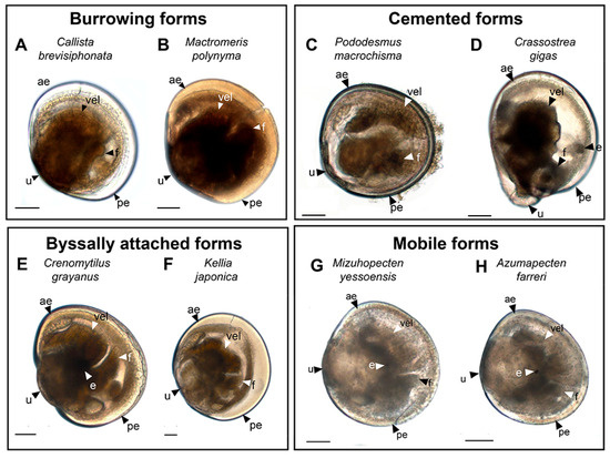 General view of pediveligers of burrowing adult bivalves (Callista brevisiphonata) (A) and Mactromeris polynyma (B); pediveligers of cemented adult bivalves (Pododesmus macrochisma) (C) and Pacific oyster (Crassostrea gigas) (D); pediveligers of byssally attached adult bivalves Gray’s mussel (Crenomytilus grayanus) (E) and Japanese kellia (Kellia japonica) (F); and pediveligers of mobile adult bivalves Yesso scallop (Mizuhopecten yessoensis) (G) and Farrer’s scallop (Azumapecten farreri) (H) under light microscopy. The letter designations are as follows: ae, anterior end; e, eye; f, foot; pe, posterior end; u, umbo; vel, velum. Scale bar = 50 µm.
