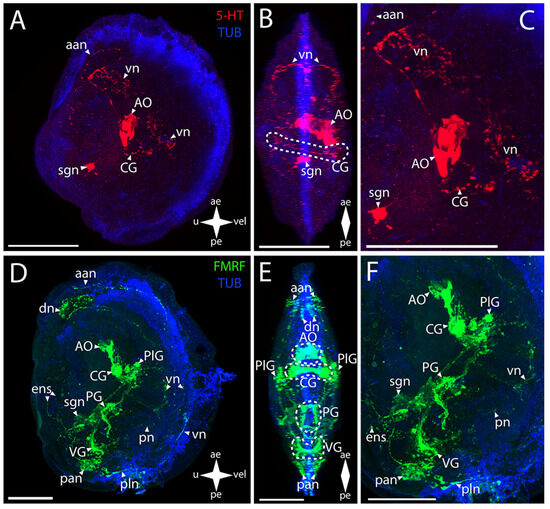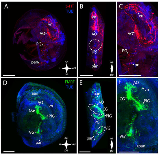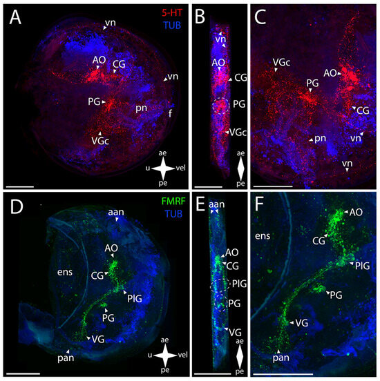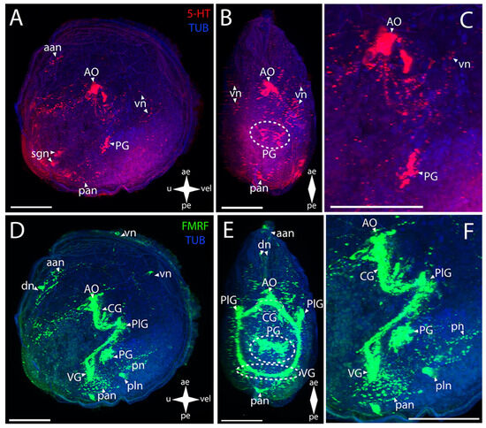 General structure of the nervous system in green falsejingle’s pediveliger (Pododesmus macrochisma). Red color indicates serotonin; green color, FMRFamide; blue color, tubulin. (A–C) Immunoreactive staining for serotonin; (D–F) Immunoreactive staining for FMRFamide; (A,C) lateral view; (B,D) umbo view; (C,F) magnifications of the CNS of the pediveliger. The letter designations are as follows: AO, apical organ; aan, anterior adductor nerves; CG, cerebral ganglion; dn, dorsal neurons; pan, posterior adductor nerves; PG, pedal ganglion, PlG, pleural ganglion; pln, pallial nerves; pn, pedal nerves; sgn, stomatogastric neuron; VG, visceral ganglion; vn, velum neurons. Crossed arrows indicate orientation of the pediveliger: ae, anterior end; pe, posterior end; u, umbo; vel, velum. Scale bar = 50 µm.