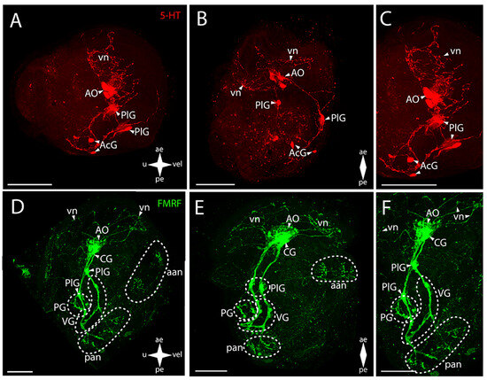 The AO and the CG, PlG, PG, and VG showed FMRFamide-immunopositive reaction (Figure 8D–F). In the AO, an aggregation of FMRFamide is observed around the above-described 5-HT-immunopositive cells, with a dense commissure of paired CG located tightly near it (Figure 8E). The paired broad lateral bundles of neurites extend from them to the aggregation of neurons of the PlG. These aggregations are interconnected via a thin commissure (Figure 8E). Double staining for FMRFamide and 5-HT shows AO, CG, PG, and VG (Figure S2)