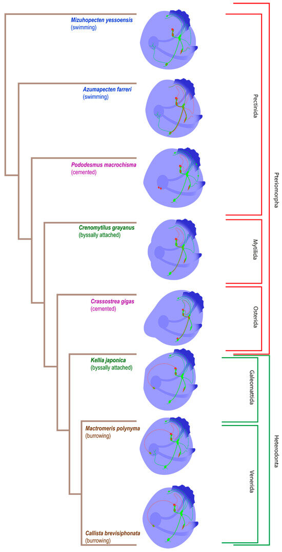 The following supporting information can be downloaded at: https://www.mdpi.com/article/10.3390/biology12101341/s1, Figure S1: General structure of the nervous system in the Japanese callista clam’s pediveliger (Callista brevisiphonata); Figure S2: General structure of the nervous system in Yesso scallop’s pediveliger (Mizuhopecten yessoensis).