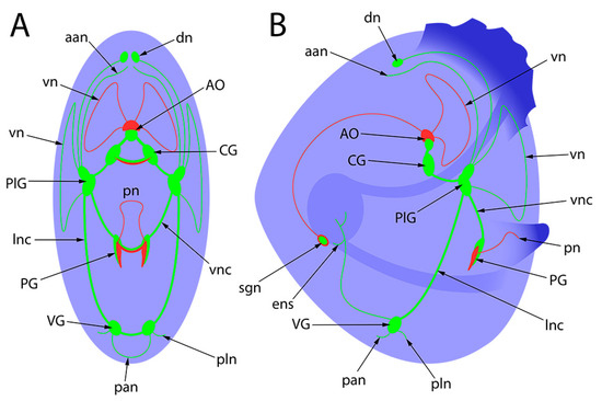 - Yurchenko, O.V.; Savelieva, A.V.; Kolotuchina, N.K.; Voronezhskaya, E.E.; Dyachuk, V.A. Peripheral sensory neurons govern development of the nervous system in bivalve larvae. EvoDevo 2019, 10, 22. [Google Scholar] [CrossRef] [PubMed]