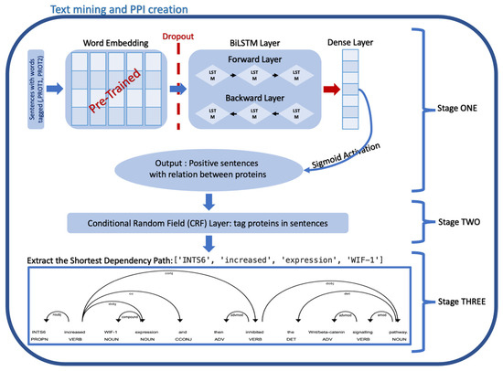 With the emergence of Natural Language Processing (NLP) methods, PPI extraction from biomedical abstracts becomes feasible. The most challenging aspect of the job involves interpreting biological and biomedical language in order to obtain a meaningful explanation of all living things’ complicated nature. Another challenge lies in the need to search through a large number of articles to find an explanation for the cause of the disease, particularly in the case of complex diseases. PPI extraction can be interpreted in several different techniques, and many machine learning and deep learning techniques have been implemented. Kernel-based machine learning methods have attained good performance, but they require extensive feature engineering, including lexical and syntactic features [9,10,11,12]. In contrast, the application of Neural Networks (NNs) to learn the semantic features and structure of sentences in order to classify them has been regarded as an effective technique for PPI extractions because they do not require an extensive amount of feature engineering like the kernel-based method does [13]. Previous attempts for extracting sentences with relationships between proteins’ names in text were developed using machine learning (ML) and deep learning (DL) schemes. These attempts achieved the highest level of implementation in the field of PPI extraction from text, with deep learning methods being more accurate and achieving greater performance [14,15,16,17]. The objectives of PPI mining can be illustrated as a binary classification problem to distinguish positive sentences from negative ones. Positive sentences would contain the names of proteins in conjunction with relationship words, while negative sentences would represent the opposite [18,19]. Another technique is the named entity recognition (NER) method [20]. This method relies on features engineering and training on datasets so as to recognize proteins’ names in sentences and relationship words.