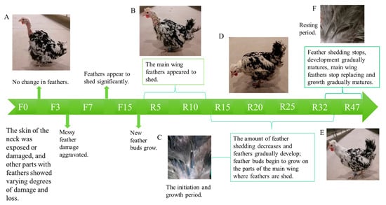Figure 1. Feather changes during IM: (A) F0 period’s feather state; (B) R10 period’s feather state; (C) feathers in the initiation and growth phases; (D) R28 period’s feather state; (E) R47 period’s feather state; (F) resting feathers.