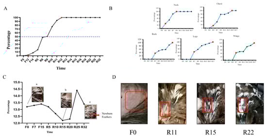 As observed in Figure 2A, the shedding of chicken feathers initiated in the late-laying hens starting from F13. The feather loss rate reached 50% during R6, and it reached 100% during R12. Feather shedding completely ceased by the R25 period.