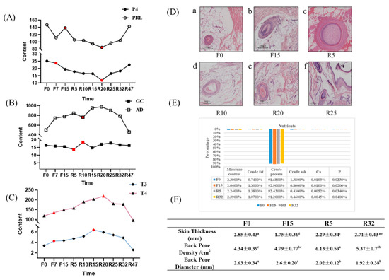 Figure 3. Hormone content changes, section observation, whole-body feather nutrient composition, and hair follicle traits: (A) changes in sex hormone content; (B) changes in hormone levels related to the adrenal axis; (C) changes in the levels of thyroid hormones; (The red dots represent periods when hormone levels vary significantly.); (D) the cross-sectional view of the dorsal skin HF at different periods; F0, F15, R5, R10, R20, and R25 are time points a–f, respectively. (E) results of the determination of each feather component in the periods of F0, F15, R5, and R32; (F) dorsal skin thickness, hair follicle density, and diameter at different periods of induced dorsal skin exchange. Different letters indicate significant differences (p < 0.05).