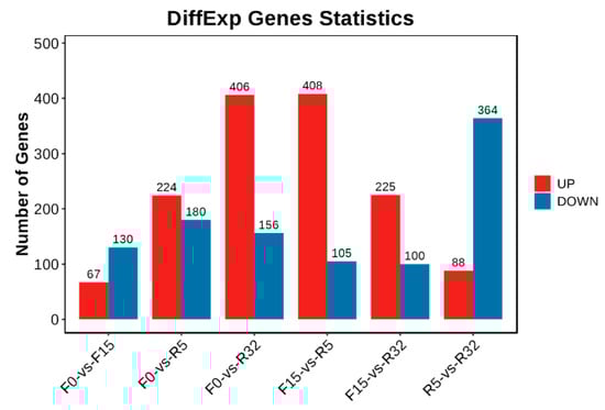 A total of 1374 upregulated genes and 1079 downregulated genes were identified (Figure 4). The majority of downregulated genes were observed in F0-VS-F15, F0-VS-R5, and R5-VS-R32, while the majority of upregulated genes were found in the F0-VS-R32, F15-VS-R5, and F15-VS-R32 groups. The log2(FC), p-value, and FDR values of the top ten genes in different comparison groups are shown in Table S2.
