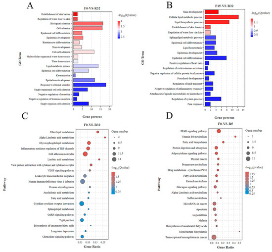 Figure 5. GO and KEGG enrichment analysis of differentially expressed genes: (A) GO of F0-VS-R32; (B) GO of F15-VS-R32; (C) KEGG of F0-VS-R32; (D) KEGG of F0-VS-R5.