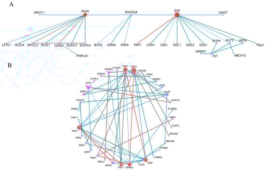 The target gene sets derived from the differential analysis and series test of cluster analysis were separately imported into the STRING database for PPI network analysis. The visualization results of the PPI network analysis were generated using Cytoscape 3.9.1 software. The top ten pivotal genes for difference analysis were DSP, FA2H, CERS3, FST, DHCR24, Krt75, SPTLC3, ELOVL7, ELOVL47, and Krt6a (Figure 7A). The top ten predicate genes for the series test of cluster analysis were CDH1, PKP1, Pkp3, DSP, EPHA1, DSC1, CadN, TCF7, DSG27, and TIAM1 (Figure 7B). Among these genes, DSP was the gene that they jointly screened.
