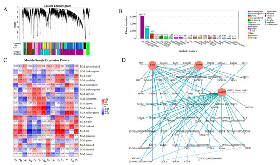 Figure 8. WGCNA analysis of skin follicle differential genes: (A) hierarchical clustering tree showing co-expression modules identified via WGCNA, with each leaf on the tree representing a gene and the main branches consisting of 19 modules marked with different colors; (B) the genes contained in each module; (C) module eigenvalues were correlated with different phenotypic data in correlation analysis (MD indicates skin density; ZJ indicates skin diameter) * p < 0.05, ** p < 0.01, *** p < 0.001; (D) the interactions of skin follicle-associated genes in a co-expression network in the selected MM.DARKTURQUOISE modules; the darker the color, the stronger the connectivity.