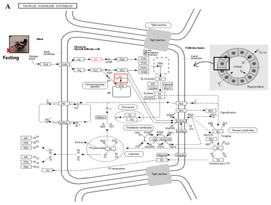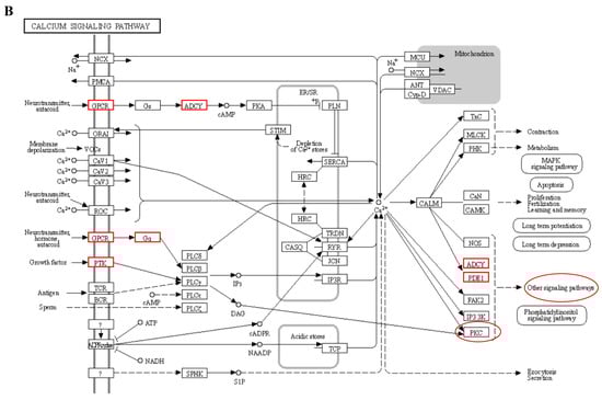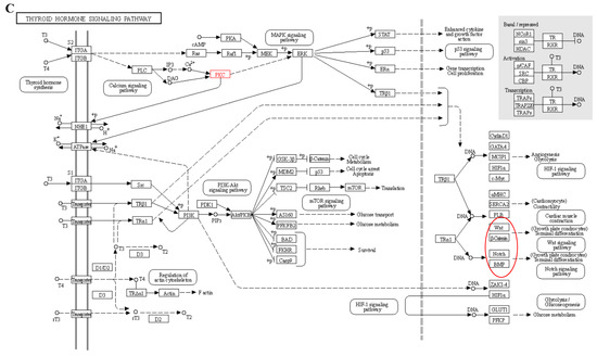 Figure 10. Signal path analysis: (A) thyroid hormone synthesis (Calcium ions within the cell are transported outside the cell via the transmembrane, as indicated by the red boxes.); (B) calcium signaling pathway; In the red box, PKC protein and calcium signal oh that pathway is involved in other pathways. (C) thyroid hormone signaling pathway. Red boxes represent pathways involved in hair follicle development.
