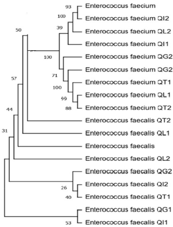For each cheese, two well-isolated and characteristic colonies were chosen from the chromogenic plates for biochemical (Gram staining, catalase, and oxidase tests) and molecular tests. For molecular identification, multiplex PCR with the primers Ent1 (TACTGACAAACCATTCATGATG) and Ent2 (AACTTCGTCACCAACGCGAAC) (112 bp) for Enterococcus spp., ddlE1 (ATCAAGTACAGTTAGTCTT) and ddlE2 (ACGATTCAAAGCTAACTG) (941 bp) for E. faecalis, and ddlF1 (GCAAGGCTTCTTAGAGA) and ddlF2 (CATCGTGTAAGCTAACTTC) (550 bp) for E. faecium were performed as described by Rocha et al. (2022) [34].