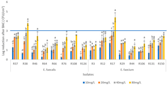 Logarithmic reduction of colony-forming units (log reduction CFU/cm2) after exposure of enterococci biofilms to four concentrations of benzalkonium chloride (BAC) (10, 20, 40, and 80 mg/mL) for 5 min. For each isolate, different letters in the columns indicate significant differences (p < 0.05) between average values. Horizontal blue line indicates log reduction threshold for minimum biofilm eradication concentration (MBEC).