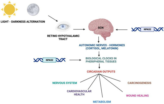 Schematic representation of the Circadian Timing System with functions and processes in which NPAS2 is involved.