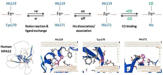 - Uchida, T.; Sagami, I.; Shimizu, T.; Ishimori, K.; Kitagawa, T. Effects of the bHLH domain on axial coordination of heme in the PAS-A domain of neuronal PAS domain protein 2 (NPAS2): Conversion from His119/Cys170 coordination to His119/His171 coordination. J. Inorg. Biochem. 2012, 108, 188–195. [Google Scholar] [CrossRef] [PubMed]