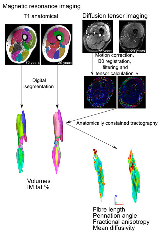 - Cameron, D.; Reiter, D.A.; Adelnia, F.; Ubaida-Mohien, C.; Bergeron, C.M.; Choi, S.; Fishbein, K.W.; Spencer, R.G.; Ferrucci, L. Age-related changes in human skeletal muscle microstructure and architecture assessed by diffusion-tensor magnetic resonance imaging and their association with muscle strength. Aging Cell 2023, 22, e13851. [Google Scholar] [CrossRef]
