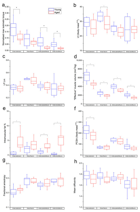 Differences in normalised maximum isometric muscle torque (a), muscle fibre length (b), Lf:Lm (c), muscle volume (normalised to body mass) (d), PCSA (e), intramuscular fat % (f), fractional anisotropy (g) and mean diffusivity (h) between the young and aged populations. Values are averaged over each muscle within each functional group. * indicates statistically significant differences (p < 0.05). On each box, the central horizontal line indicates the median value and the bottom and top edges of the box indicate the 25th and 75th percentiles. Whiskers extend to the most extreme data points.